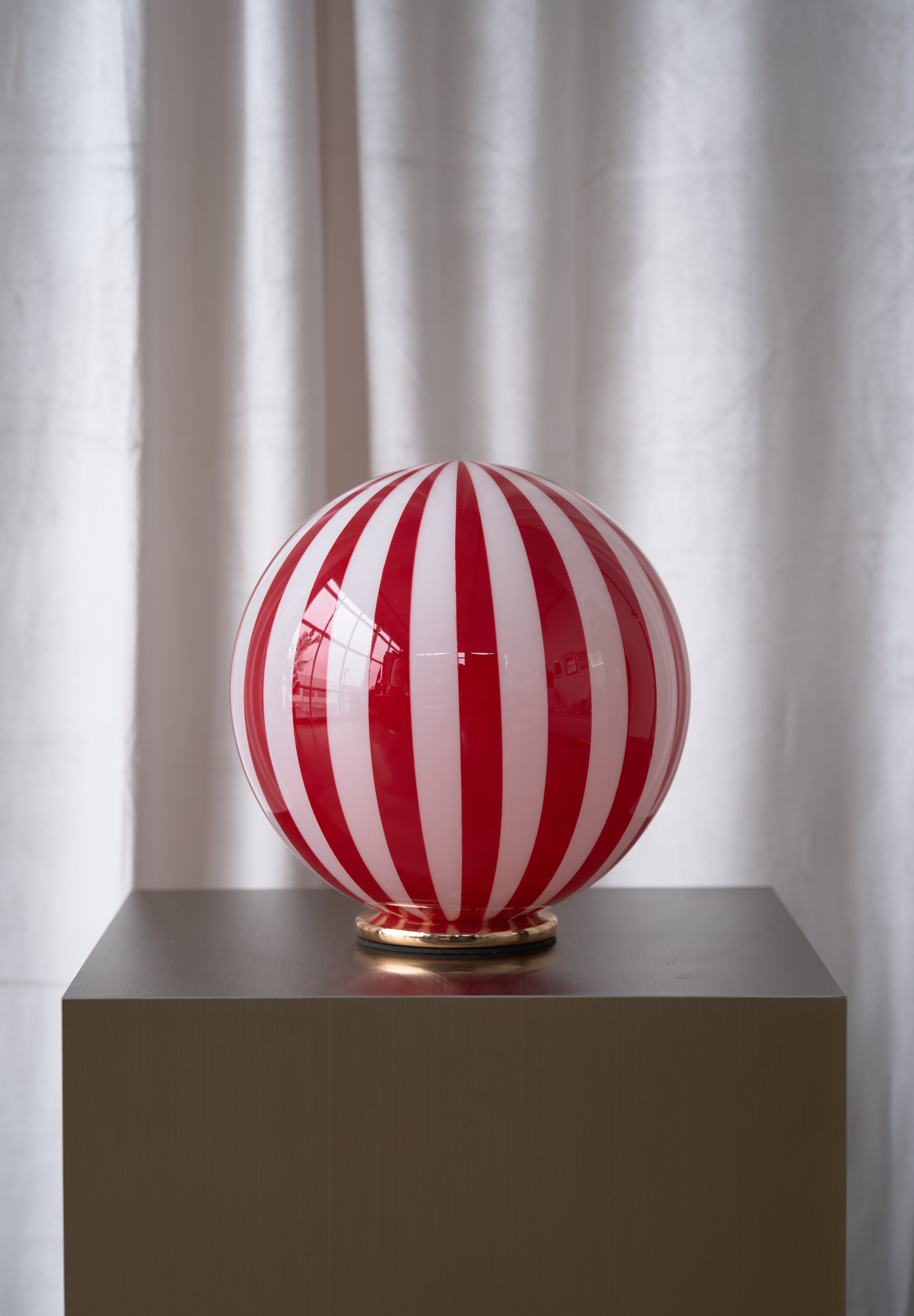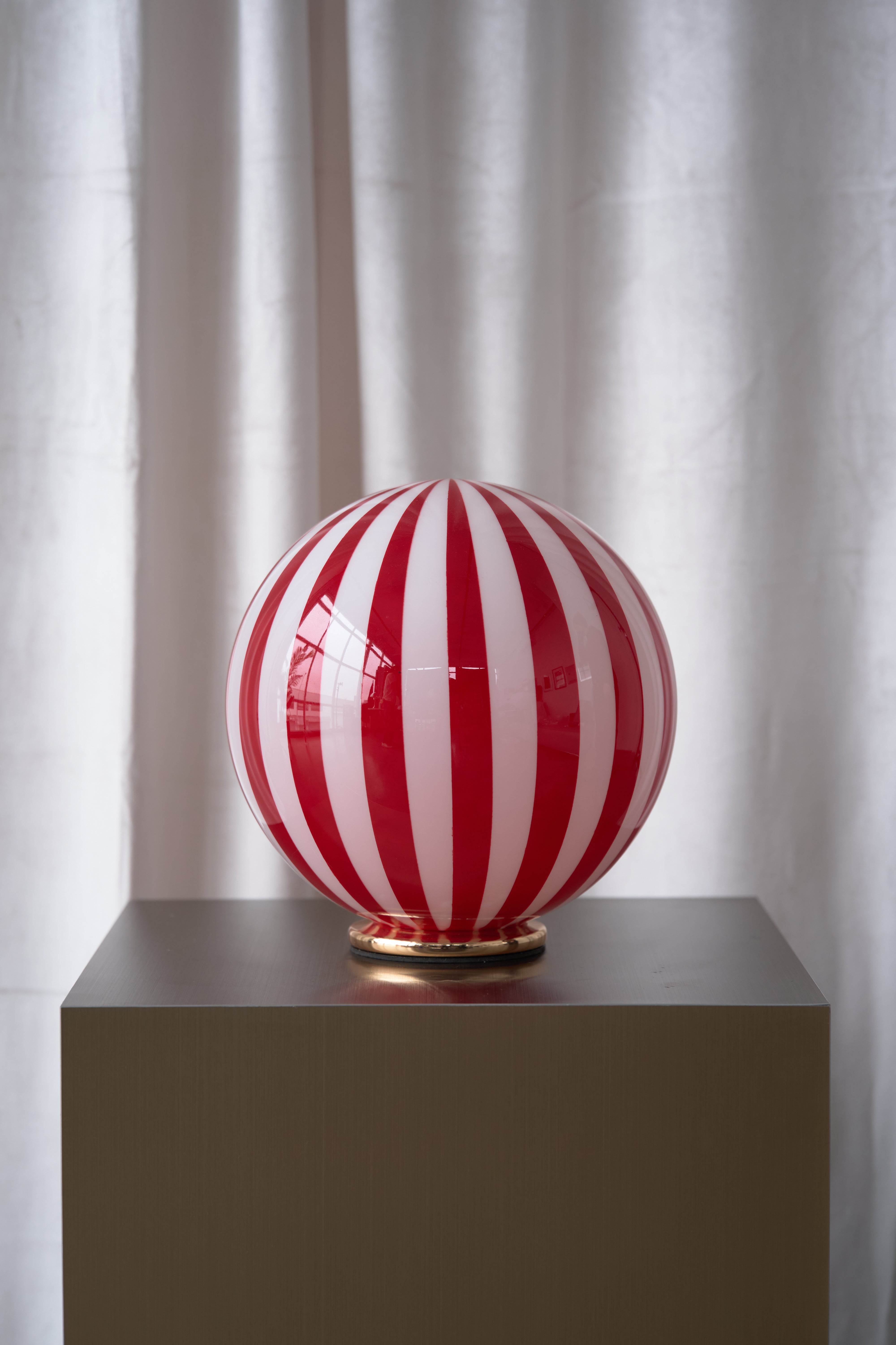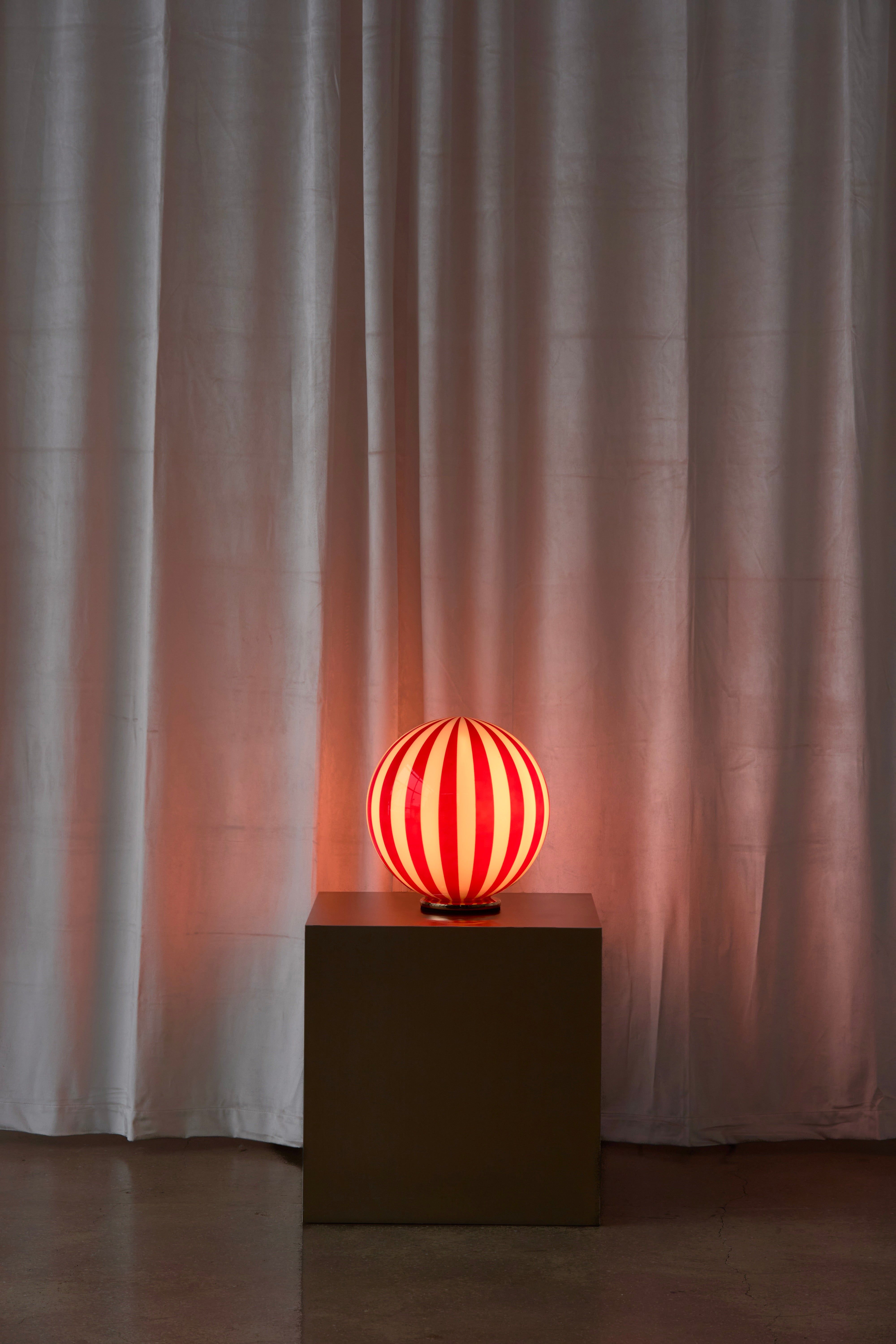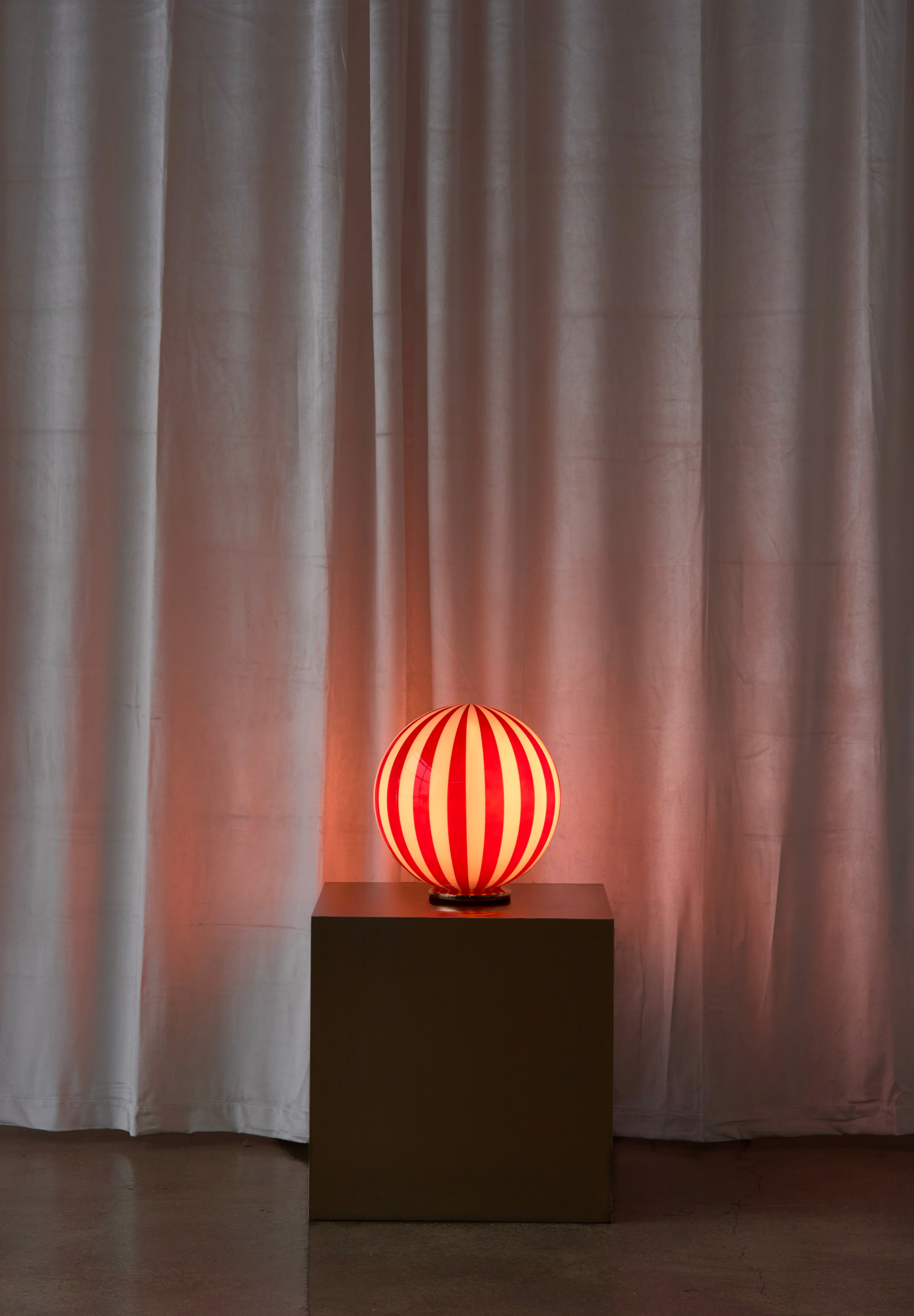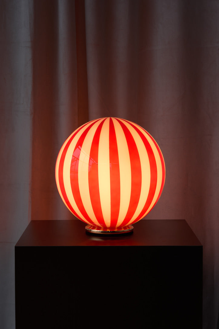 Add a pop of personality to your space with The Luca lamp — a bold blend of playful charm and refined elegance. The hand-blown glass globe and hand painted stripes nods to vintage Murano designs. It rests on a solid base with a soft powder-coated finish, offering a sleek contrast to the lively glass.