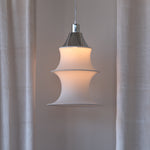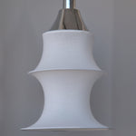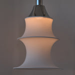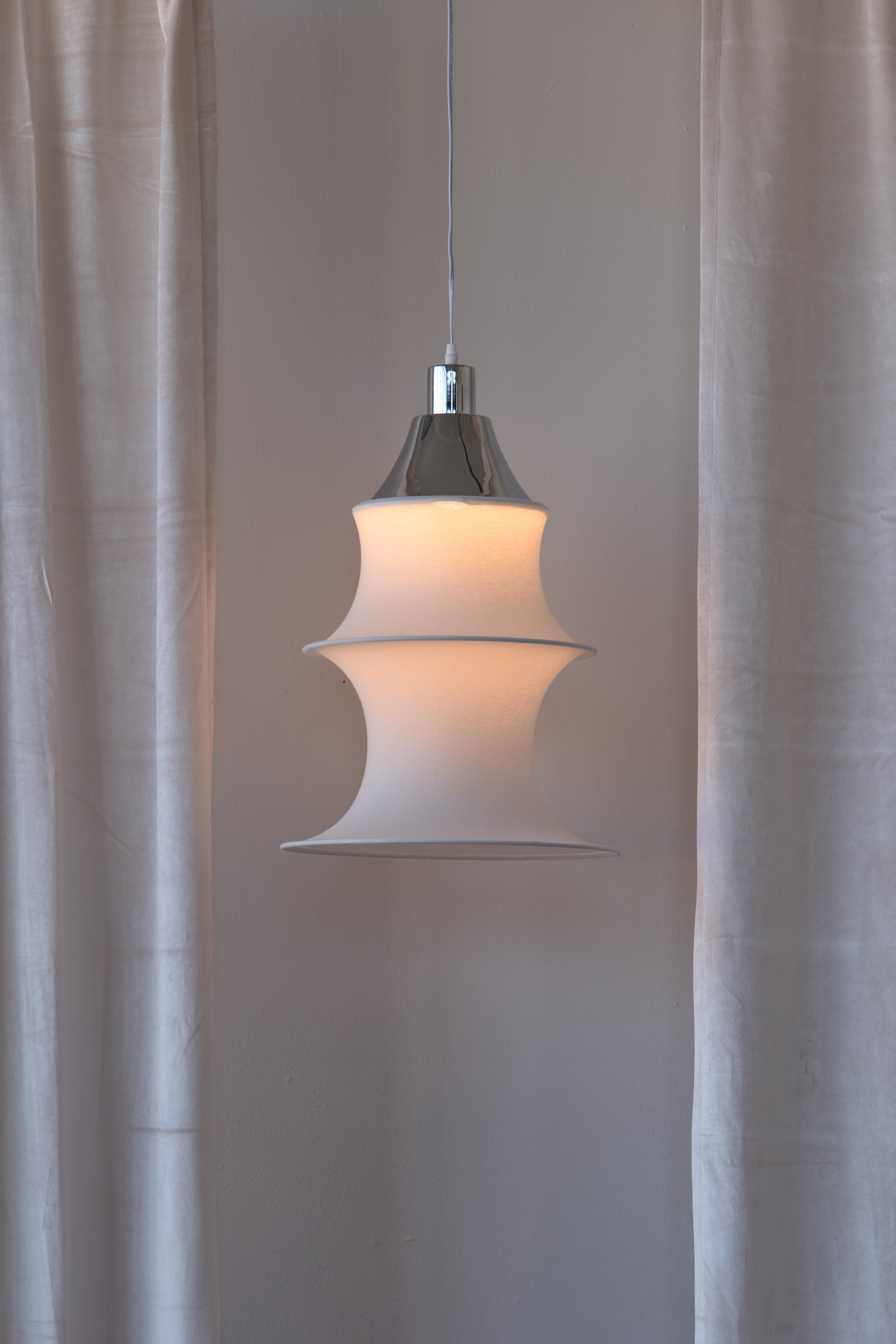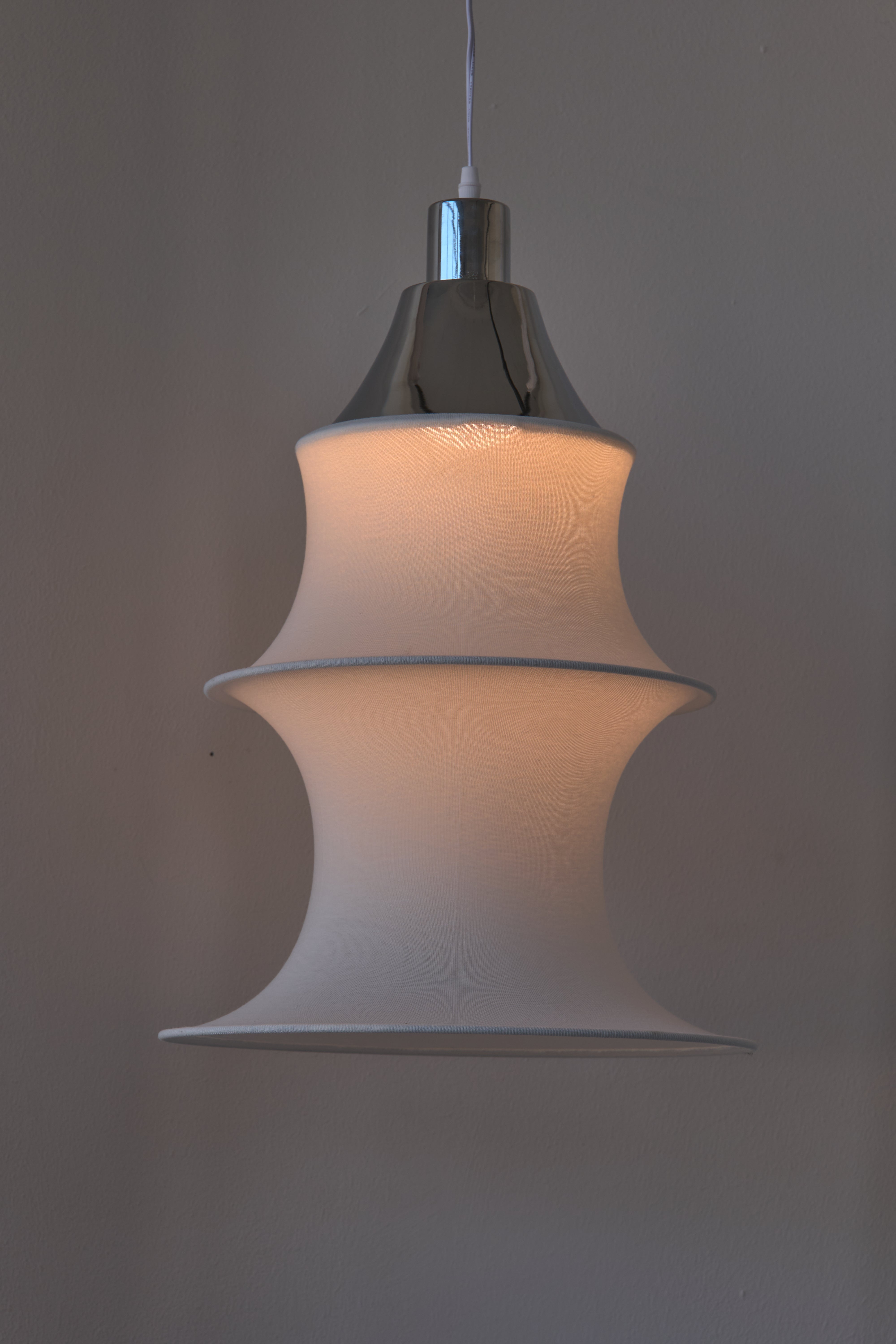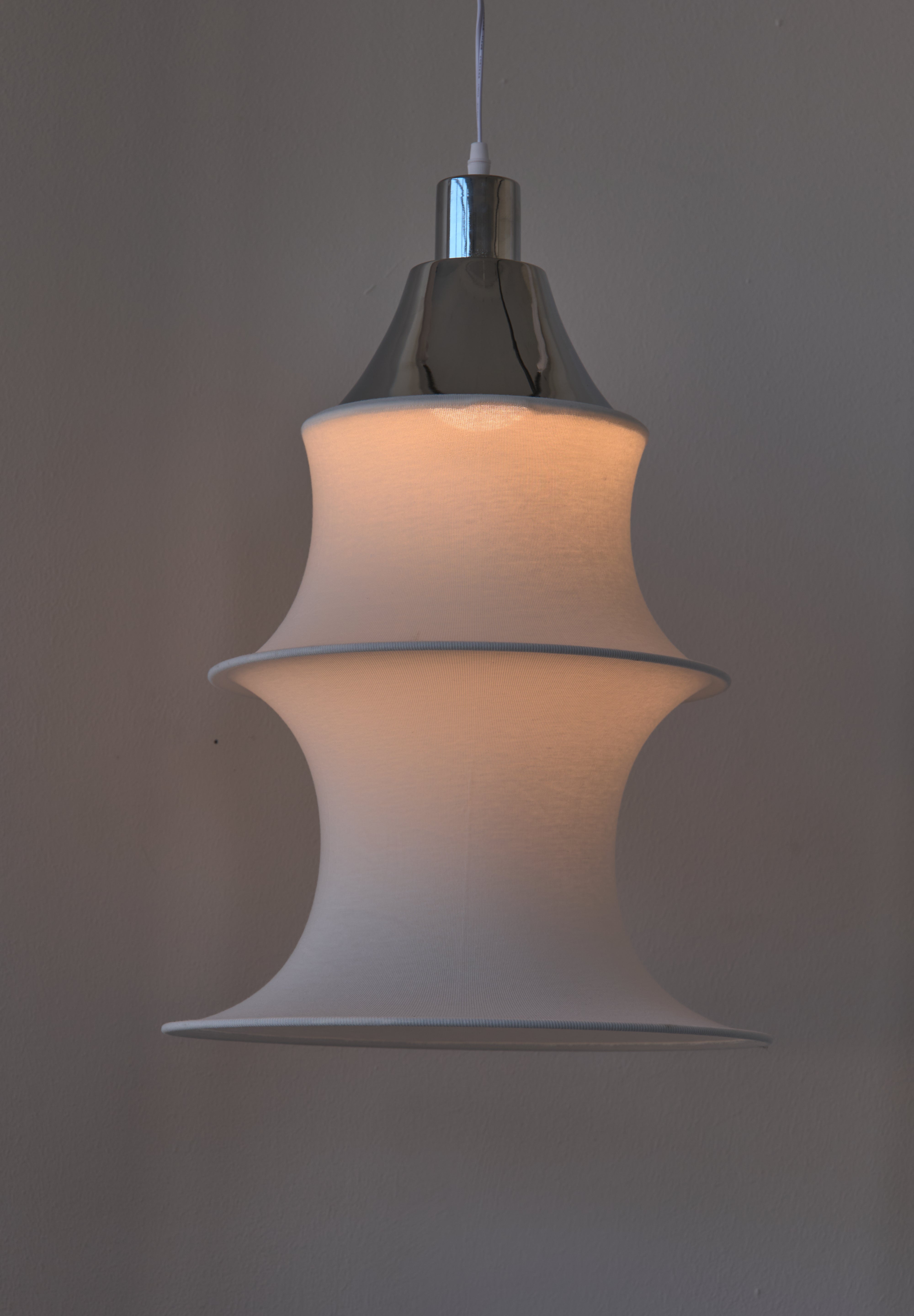 The Marina lamp is a sculptural delight. Crafted of soft stocking mesh, it's elegant form emerges through the incorporation of chrome plated iron rings of varying diameters, resulting in a linear, practical, and spontaneously formed pendant lamp. With its soft, diffused light, The Marina not only illuminates your home but also serves as a stylish sculptural piece without taking up valuable floor space.