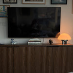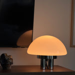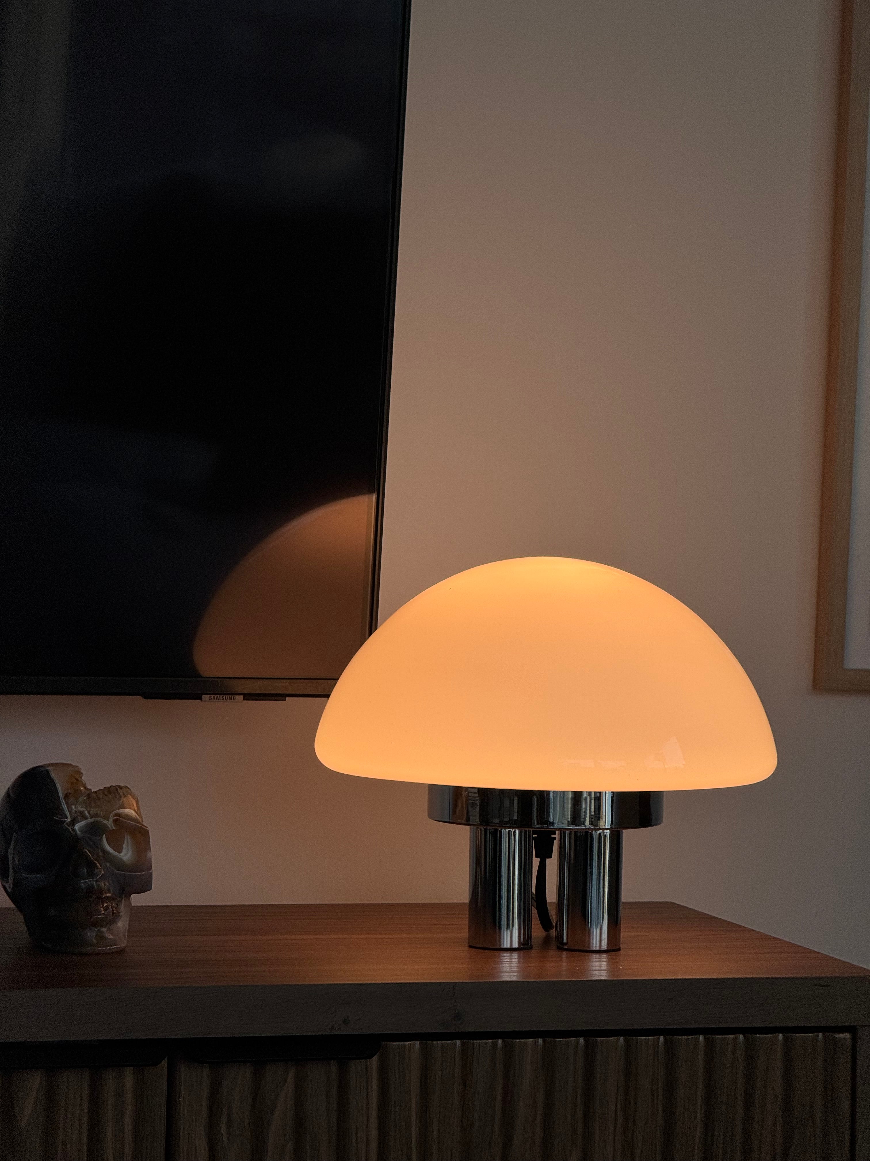 The Chroma Lamp is inspired by 1970s Italian design and the bold look of the Space Age. Its rounded, mushroom-shaped glass shade has milk glass finish that gives off a soft, warm glow. The base is made up of four wide chrome legs that add shine and stability, giving the lamp an attractive and balanced feel.