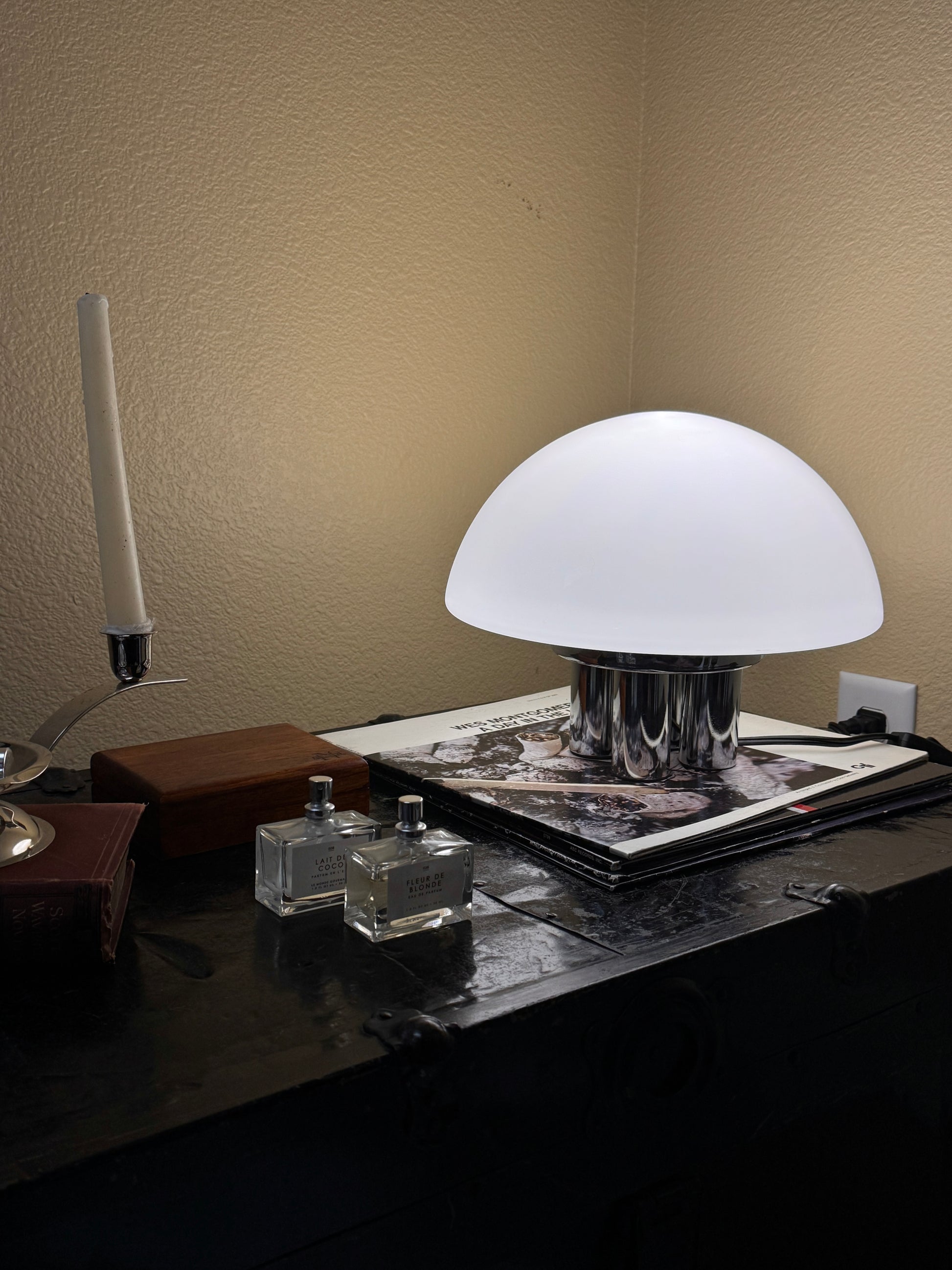 The Chroma Lamp is inspired by 1970s Italian design and the bold look of the Space Age. Its rounded, mushroom-shaped glass shade has milk glass finish that gives off a soft, warm glow. The base is made up of four wide chrome legs that add shine and stability, giving the lamp an attractive and balanced feel.