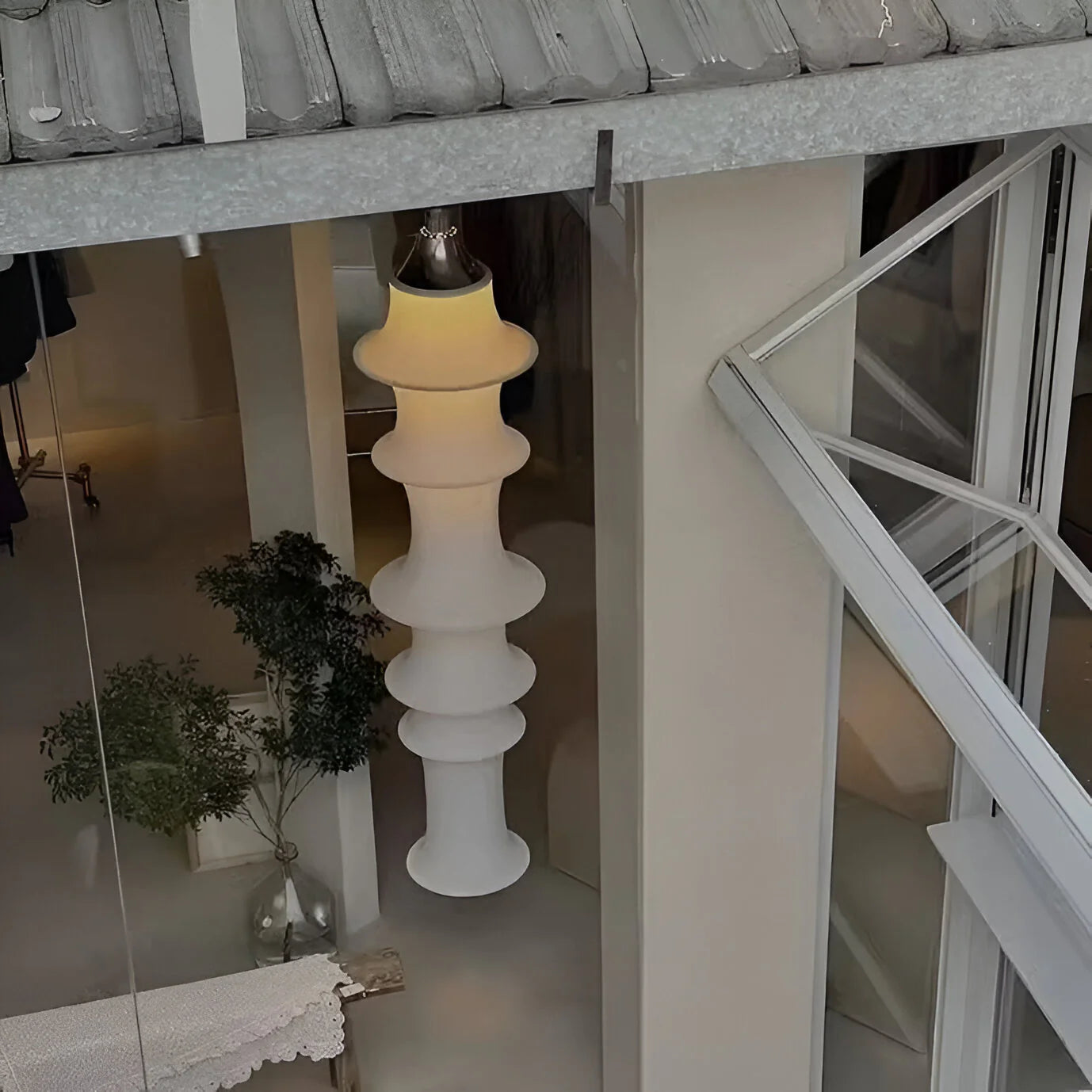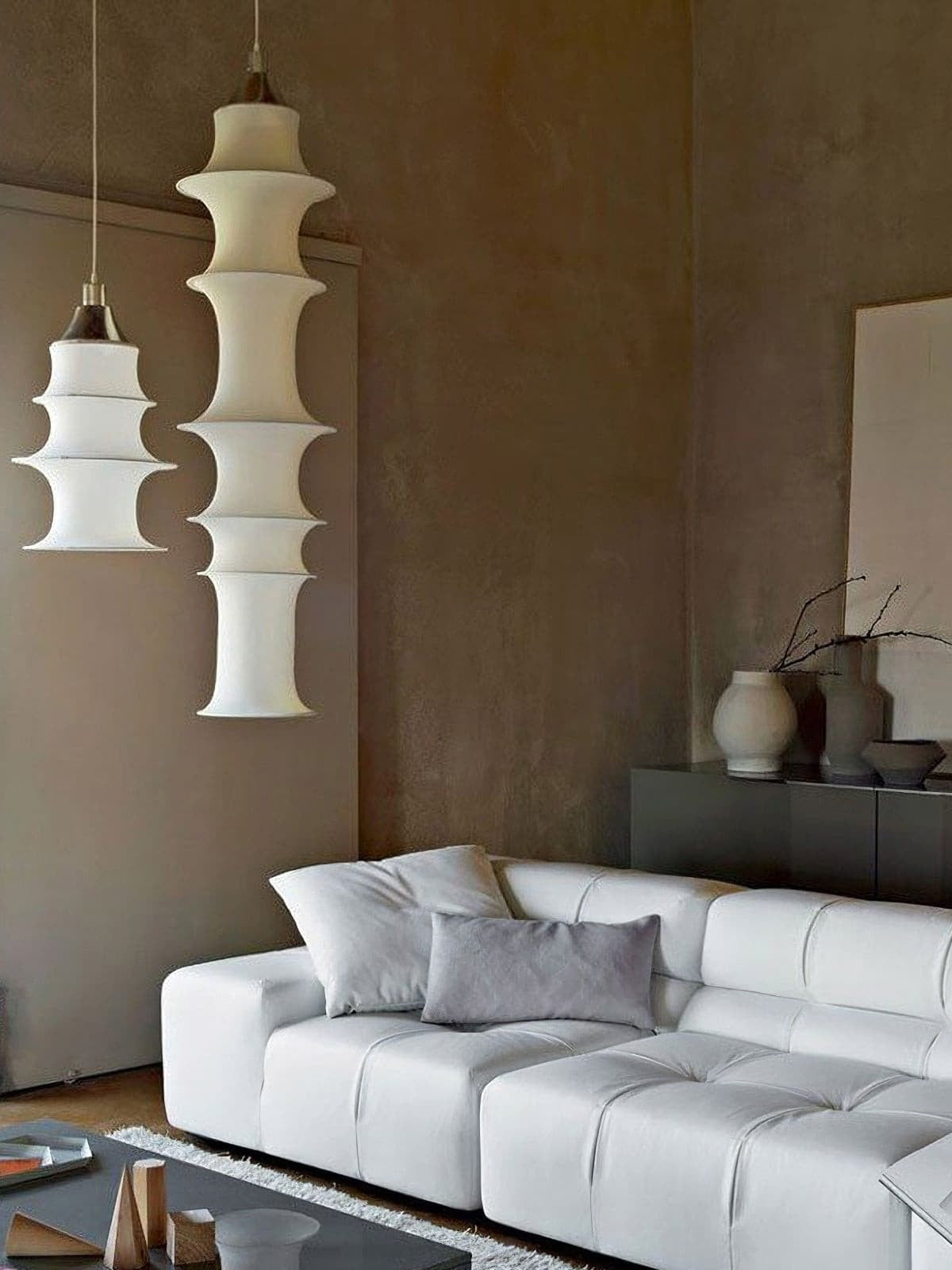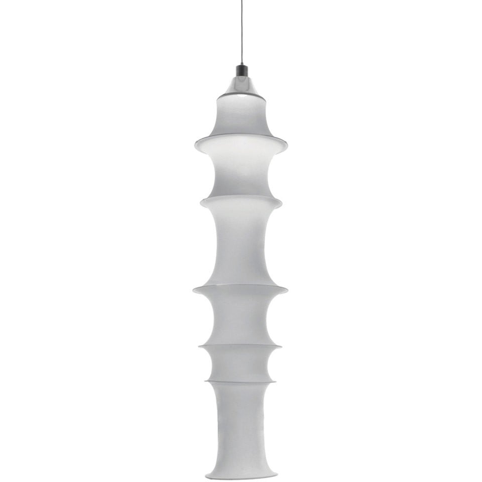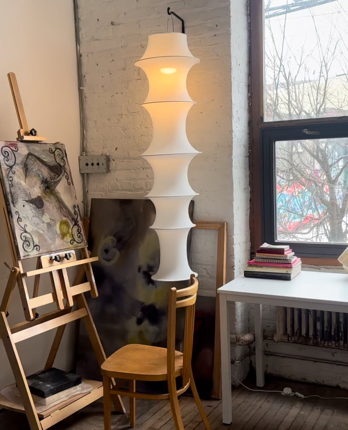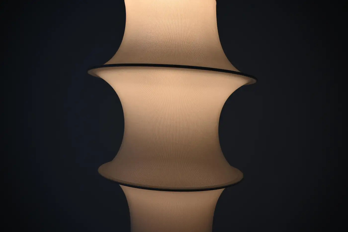 The Marina lamp is made of tubular elastic mesh, initially produced in a stocking factory. Its sculptural form emerges through the incorporation of chrome plated iron rings of varying diameters, resulting in a linear, practical, and spontaneously formed pendant lamp. With its soft, diffused light, The Marina not only illuminates your home but also serves as a stylish sculptural piece without taking up valuable floor space.