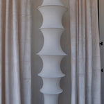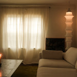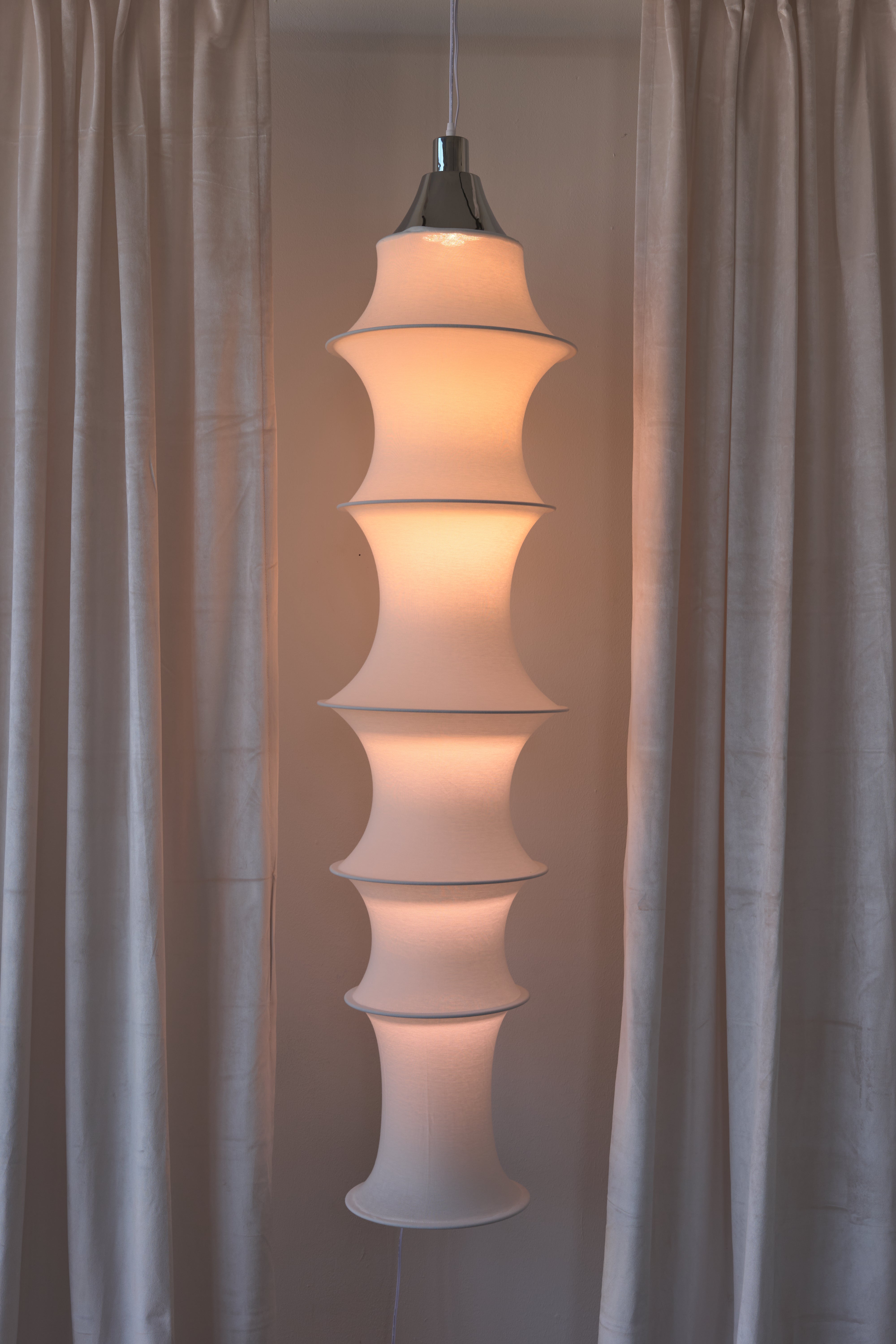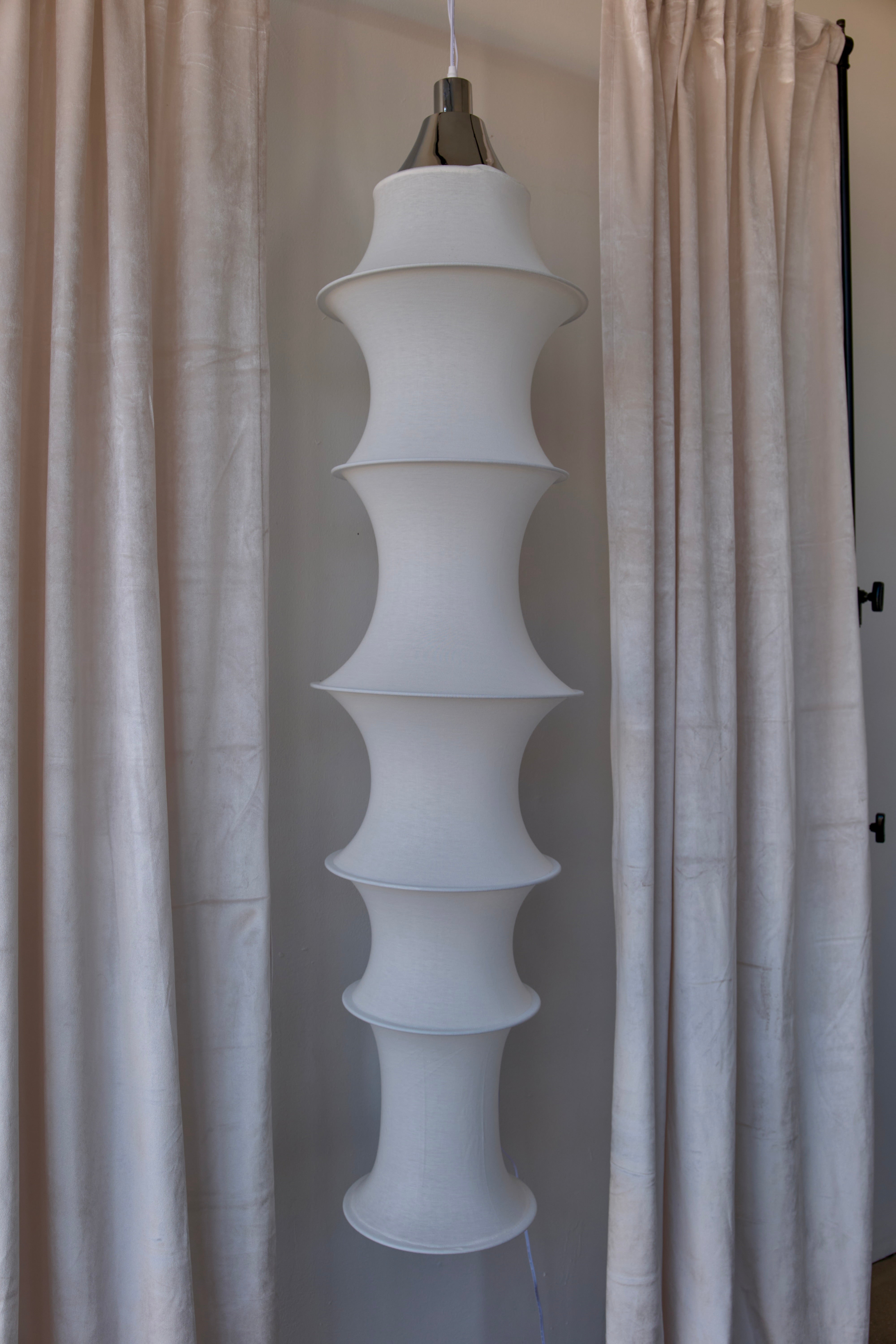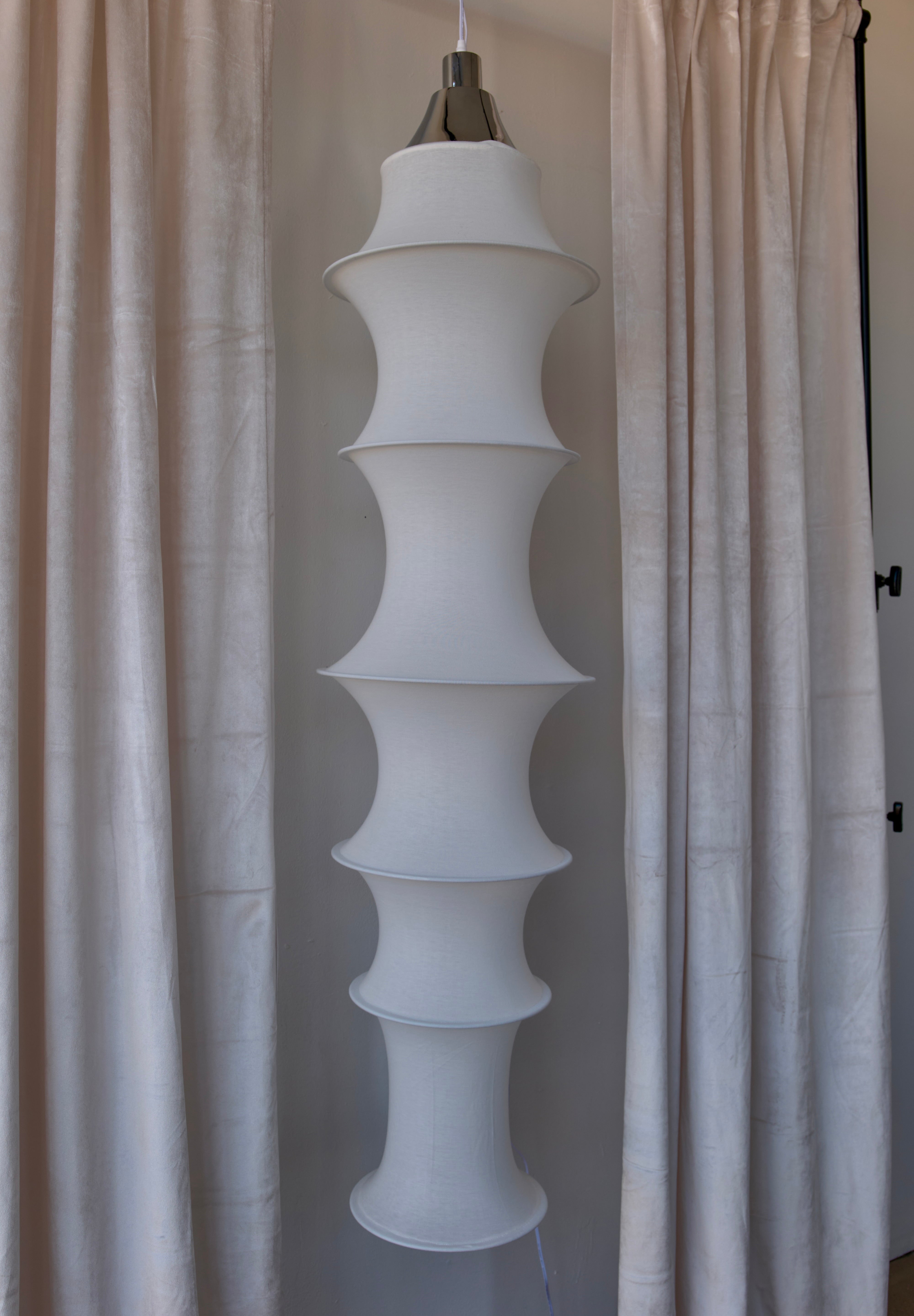 The Marina lamp is a sculptural delight. Crafted of soft stocking mesh, it's elegant form emerges through the incorporation of chrome plated iron rings of varying diameters, resulting in a linear, practical, and spontaneously formed pendant lamp. With  its soft, diffused light, The Marina not only illuminates your home but also serves as a stylish sculptural piece without taking up valuable floor space.