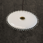 The elegant milk white body is complemented by a delicately transparent folded border, showcasing the authentic design of its era. We've opted for a genuine brass system over plastic to maintain its luxurious appeal. This elegant light fixture comes equipped with a 1-meter long grey tweed cable, ensuring it's ready to enhance your space with its timeless beauty.